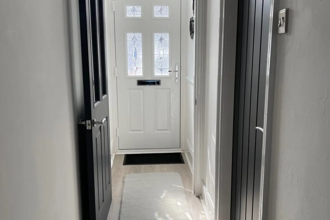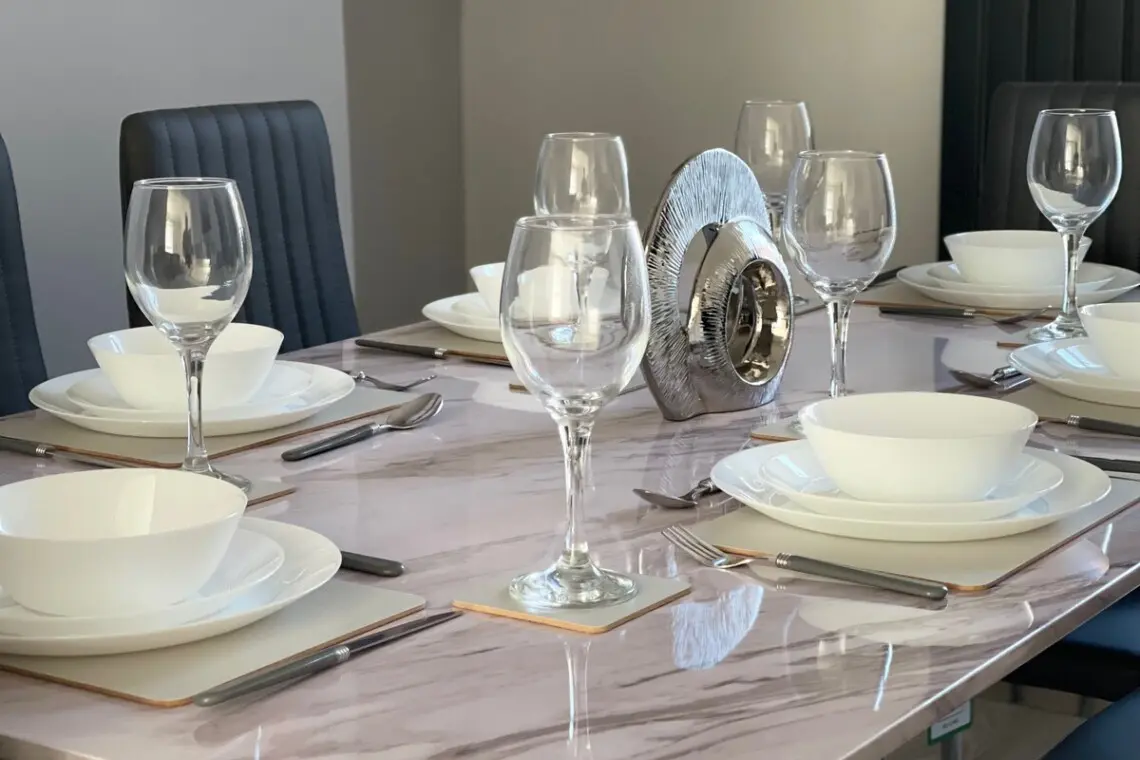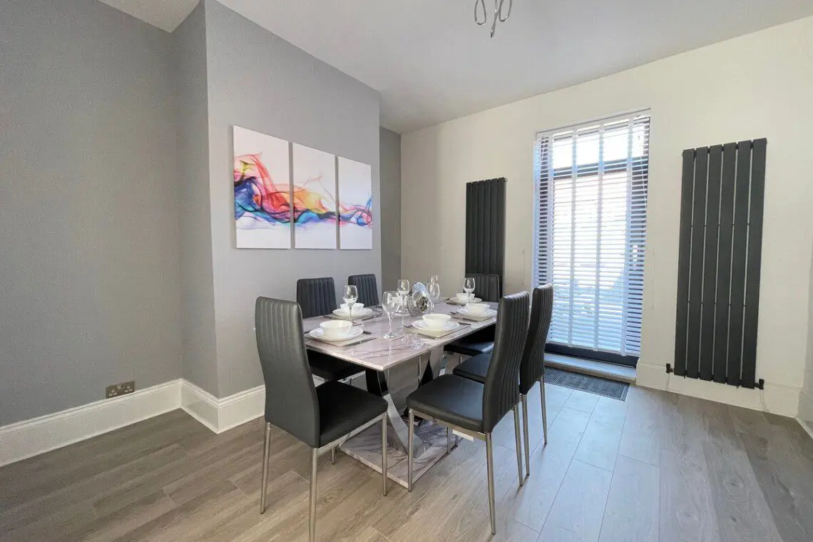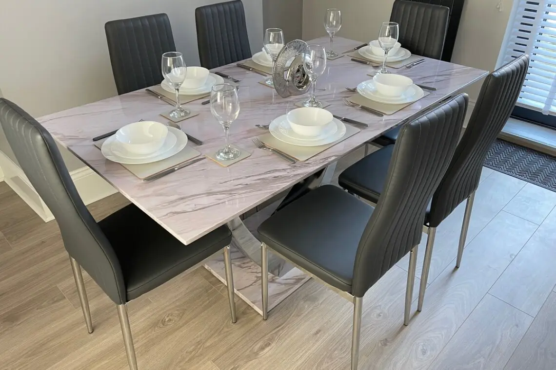 Our guests enter the property via a bright modern composite door into an entrance hallway accessing the ground floor rooms, there is a fabulous open plan lounge and dining space with a dining table, the lounge has leather sofa’s and a feature large 65” smart TV to enjoy watching your favorite shows or a movie in style!, the dining room includes an impressive six seater marble dining suite, with a patio door opening into a lovely private yard space, offering outside dining when the Sun shines!