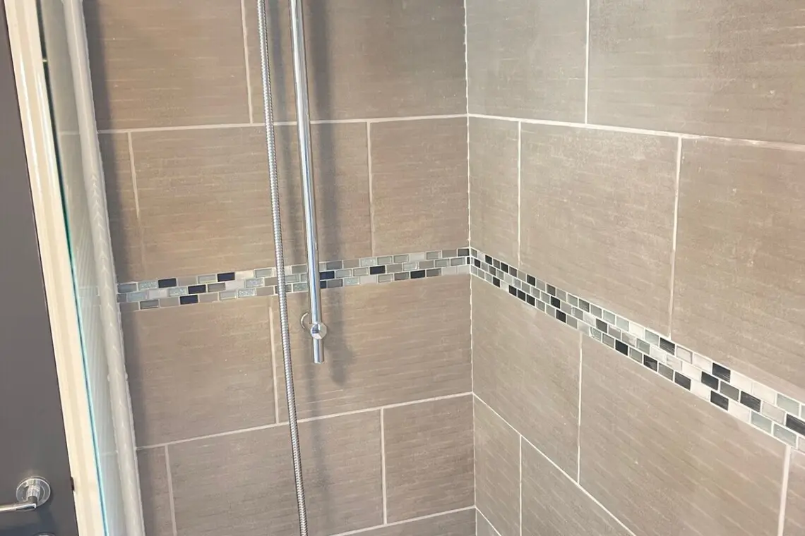 A newly fitted modern bathroom suite with a power shower over bath .