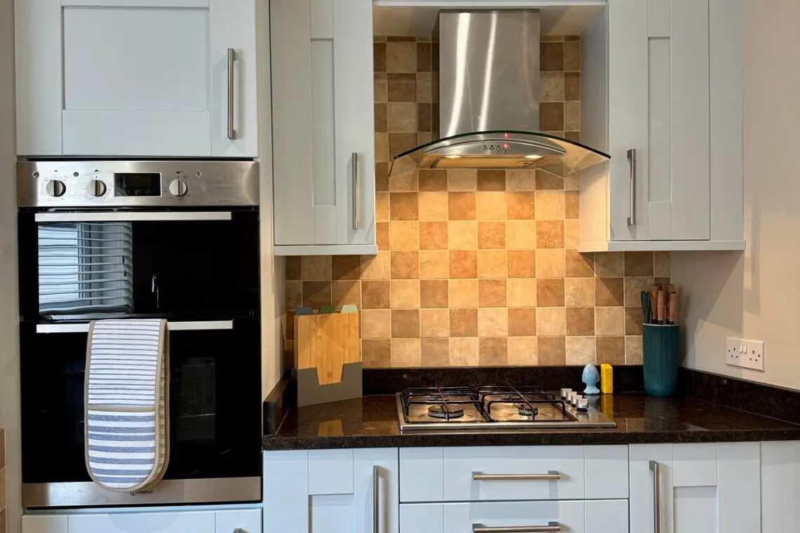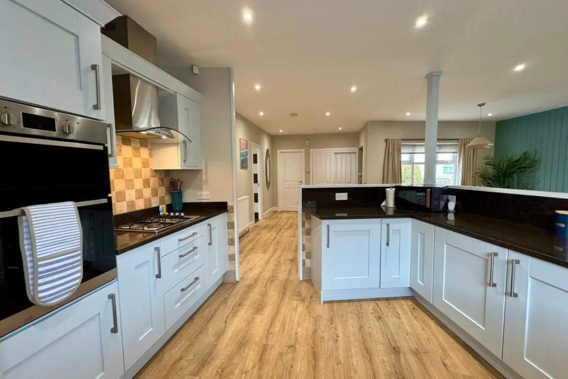 The sumptuous accommodation has a lovely open plan airy feel with attractive hardwood flooring throughout, the space includes a stunning spacious lounge and dining space with a a large wall mounted smart TV mounted on a feature timber panelled designer wall. The lounge space is furnished to the highest standard, with a beautiful open-plan kitchen area, including a 6 person dining table. Whip up any culinary delights in the fully equipped modern kitchen, including fabulous granite work surfaces, benefitting from a range of quality appliances and an impressive selection of utensils and accessories, adding that little bit of convenience and luxury to any in-house dining our guests enjoy.