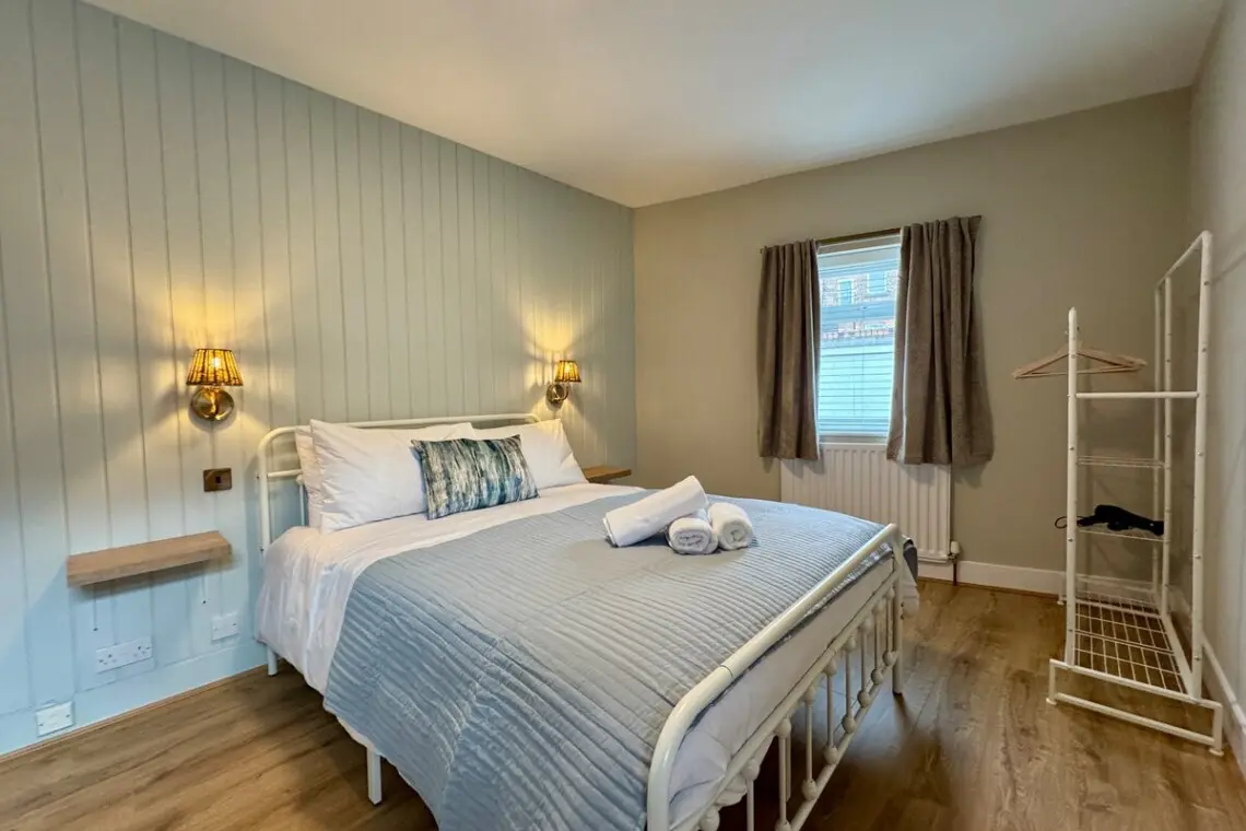 The two bedrooms are beautifully fitted, the master bedroom has king sized bed, ample wardrobe space, and a further useful single bed tucked in, offering a great space for families, a full impressive bathroom with a corner shower stall and a separate feature traditional roll top bath.